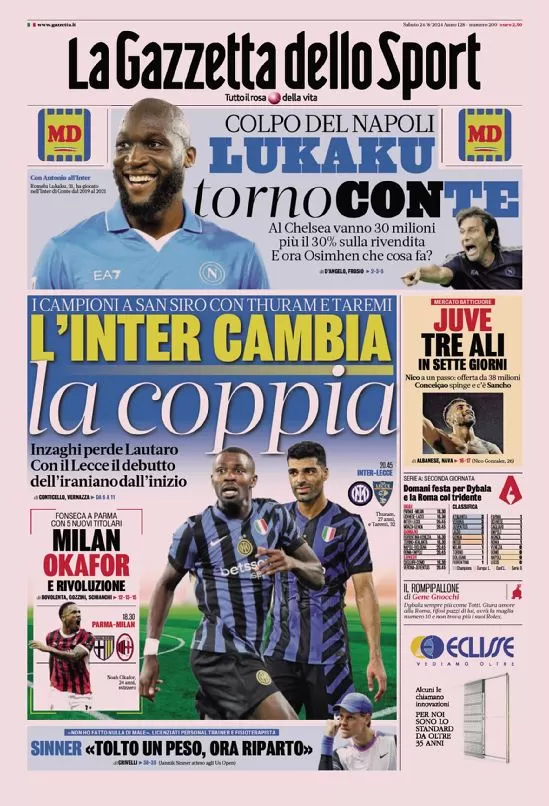 INTER PRIME PAGINE QUOTIDIANI SPORTIVI - Di seguito vi riportiamo i titoli sull'Inter e le prime pagine dei principali quotidiani sportivi di oggi, venerdì 24 agosto 2024.